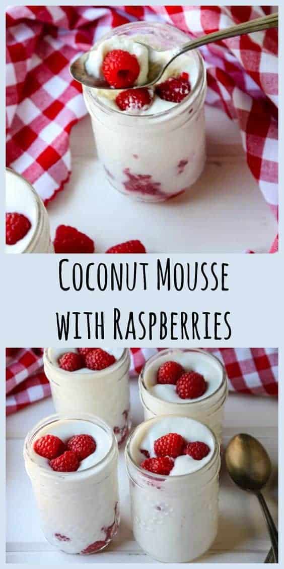 I love using ½ pint mason jars for desserts. These individual coconut mousse with raspberries are perfect for taking on picnics. Just twist the lids on, and tuck the jars into your cooler. They are a perfect ending to a picnic meal. Just be sure to remember to pack the spoons. (Speaking from experience, here)