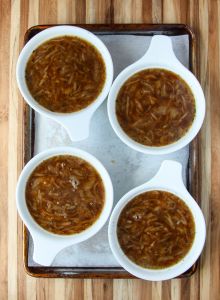 - Put six French onion soup bowls or oven-safe soup bowls on a baking sheet and ladle soup into each one.